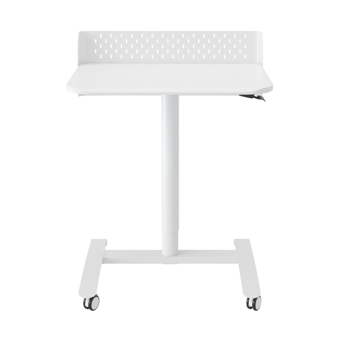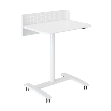 SPR-BUDDY-22-MWW to kompaktowe stanowisko robocze w białym kolorze z płynną regulacją wysokości na siłowniku gazowym (jak w fotelu biurowym). Wysokość ustawiasz wygodnie za pomocą dźwigni, dobierając dokładnie takie ustawienie, jakiego potrzebujesz — w zakresie 66,5–105,1 cm. Blat 70 × 50 cm zapewnia praktyczną przestrzeń na laptop, klawiaturę i niezbędne akcesoria, a konstrukcja ze stali z elementami PP oraz blat z płyty wiórowej tworzą stabilną bazę do codziennej pracy i nauki.