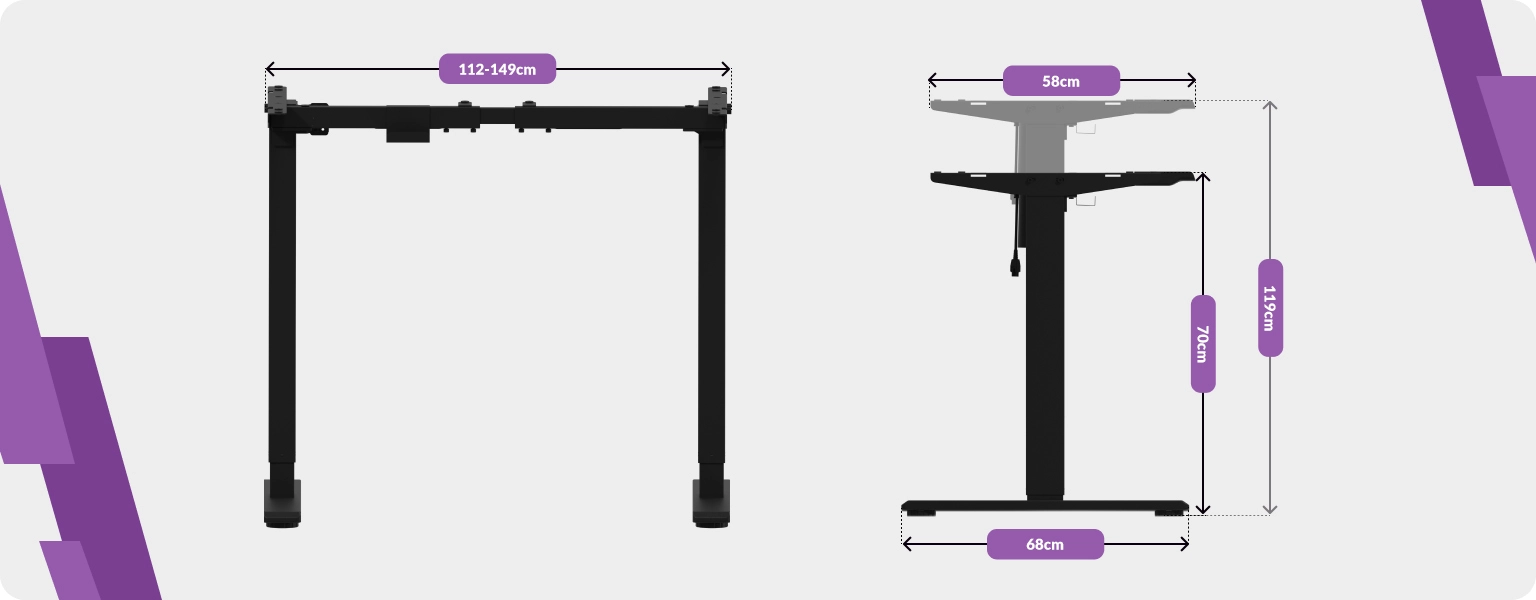 Dzięki wykorzystaniu 2 segmentów podnoszących stelaż, jest on stabilny i pozwala podnosić biurko na wysokość 119cm. Dzięki temu można pracować komfortowo zarówno w pozycji stojącej jak i siedzącej. Stelaż posiada prostokątny kształty kolumn, przez co sprawdzi się w każdych wnętrzach, również w tych nowoczesnych. Stopa również jest elegancka i posiada regulowane nóżki, dzięki czemu możesz wyrównać wszelkie nierówności podłogi.