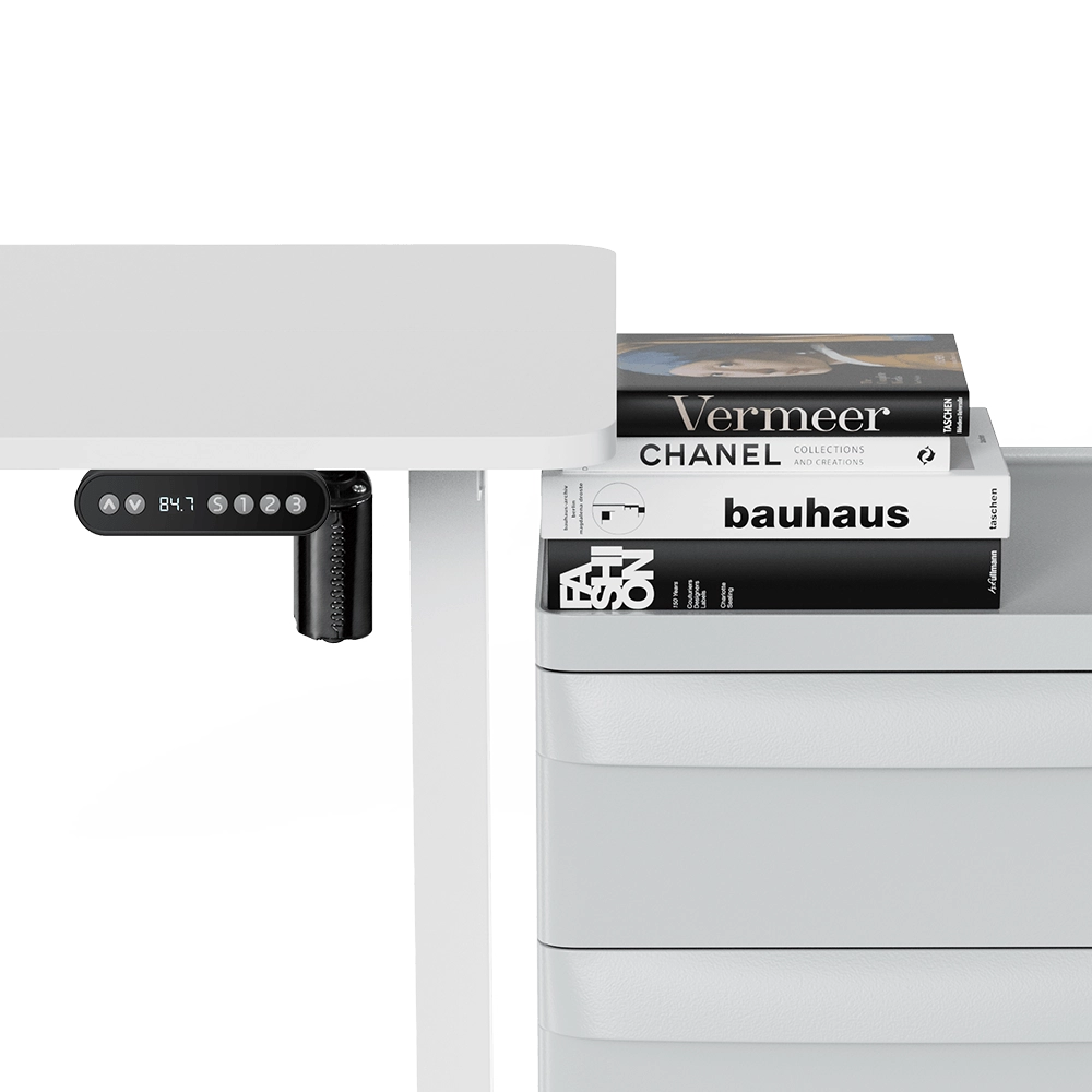 Przyciski góra/dół pozwalają na łatwe dostosowanie idealnej wysokości. Dzięki trzem programowalnym przyciskom możesz zapisać swoje ulubione pozycje i wrócić do każdej z nich poprzez jedno kliknięcie, np. wtedy gdy chcesz pracować na stojąco. Aktualna wysokość ergonomicznego biurka jest pokazywana na wyświetlaczu.