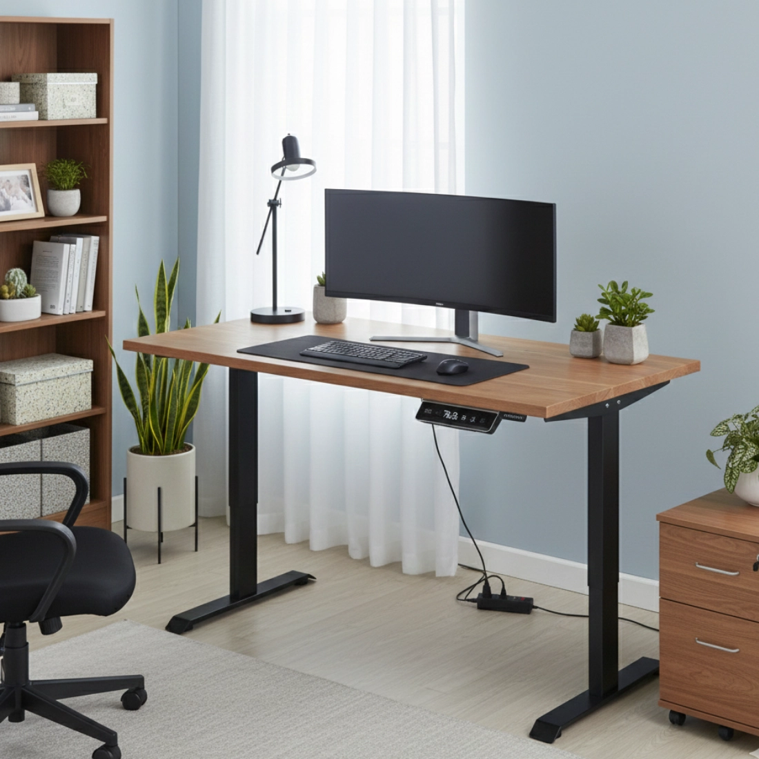 Zakres regulacji 720–1200 mm umożliwia wygodne ustawienie biurka zarówno do pracy siedzącej, jak i stojącej. Płynna praca napędu utrzymuje stałą prędkość regulacji, a wbudowane zabezpieczenia chronią mechanizm przed przegrzaniem i przeciążeniem.