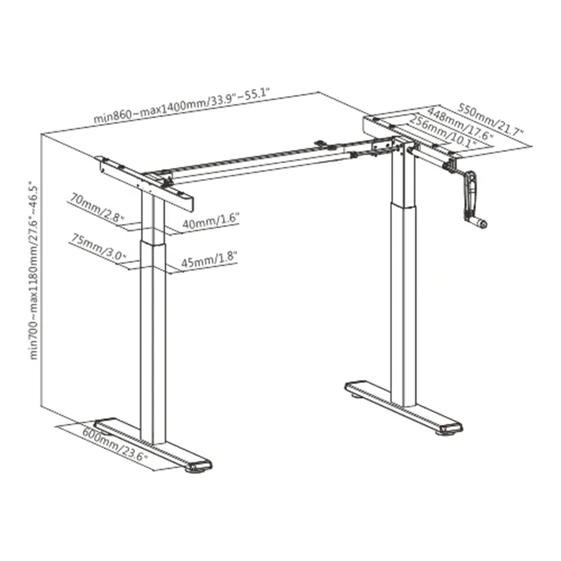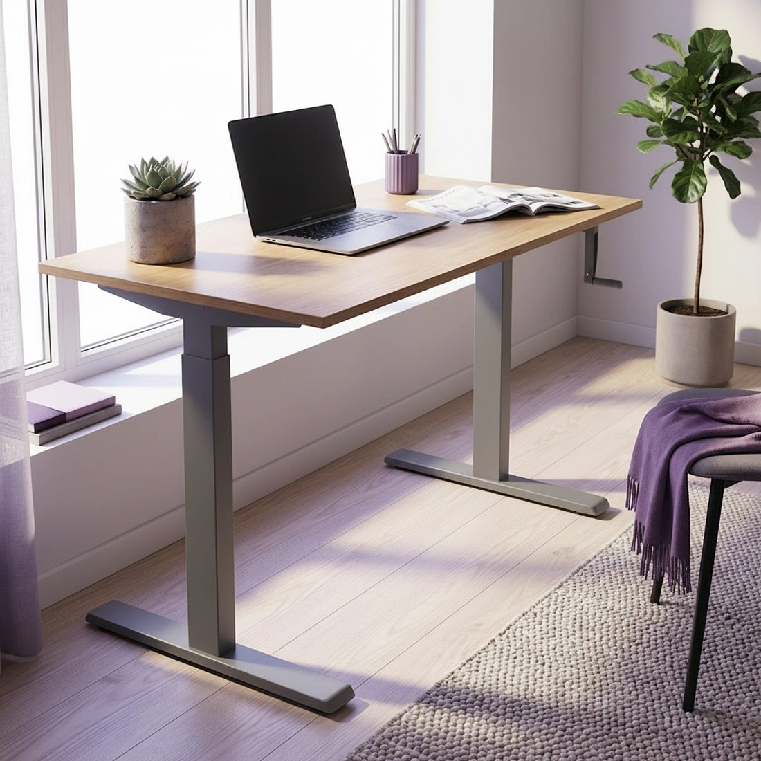 Manualna regulacja wysokości – wygodna korbka umożliwia płynną zmianę wysokości biurka bez użycia prądu