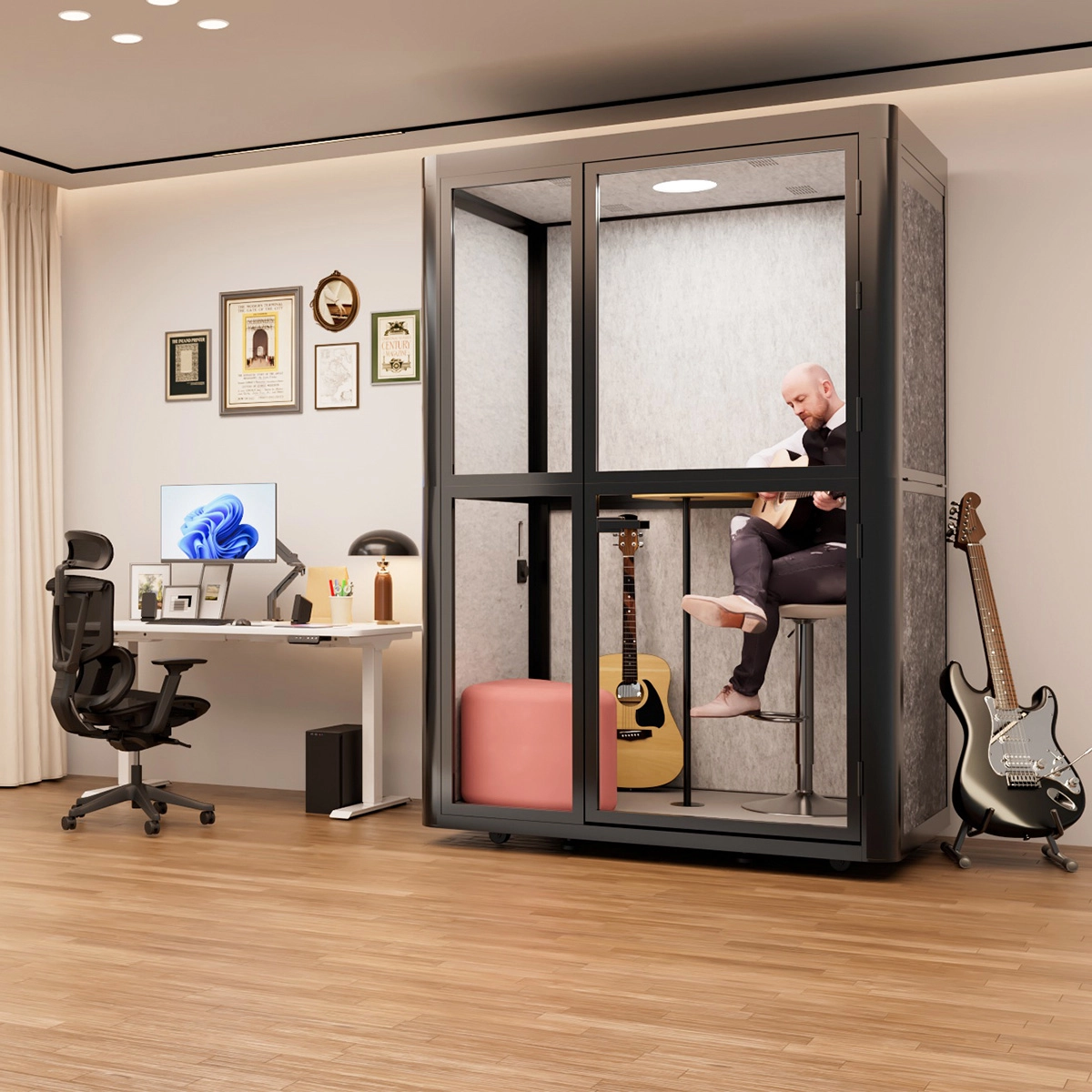 Jednak kabinę dźwiękoszczelną możesz również wykorzystać w innych miejscach. Miejscach, które nie są tak zaludnione, w których jednak wciąż musisz się skupić. Dobrym przykładem może być po prostu Twój dom. Gdy pracujesz w trybie home office, a twój sąsiad robi akurat remont, lub Twoje małe dziecko bawi się z przyjaciółmi.