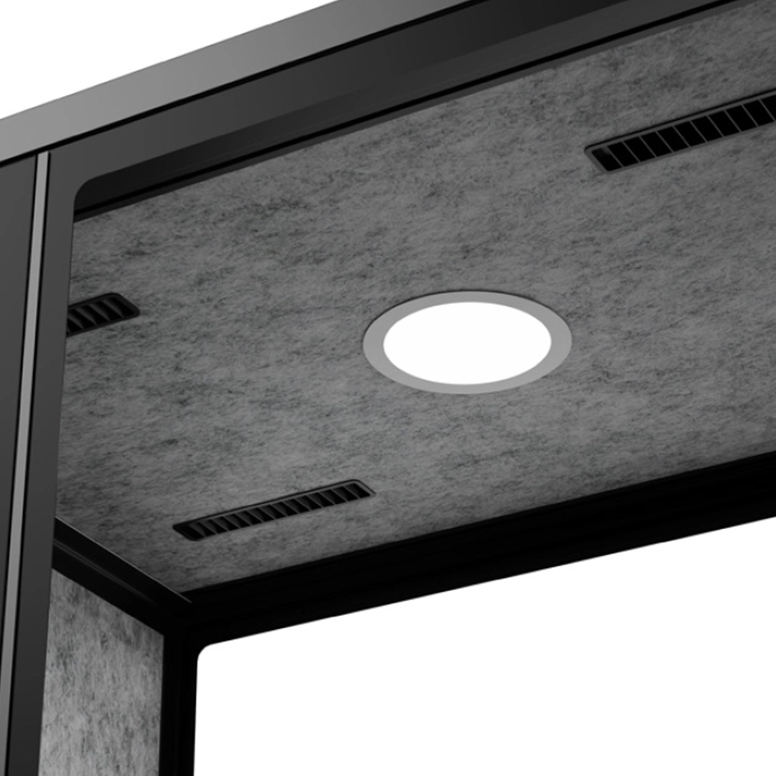 Jednak spokój i cisza to nie wszystko, czego potrzebujesz, by móc komfortowo pracować. Dlatego też wewnątrz kabiny akustycznej Spacetronik SPE-POD22 możesz umieścić stolik o powierzchni 500×800 mm. Idealny, by położyć na nim laptopa, przybory biurowe czy też po prostu śniadanie lub książkę. Pozwoli Ci to na wygodną pracę. Dodatkowo, w trosce o to byś mógł pracować o każdej porze, kabina została wyposażona w regulowane światło. Za pomocą jednego pokrętła możesz z łatwością dostosować jasność światła wewnątrz budki, tak by dopasować warunki idealnie do swoich potrzeb. Co więcej, kabina akustyczna od góry została wyposażona w wentylatory, które dbają o prawidłową cyrkulację powietrza. Z uwagi na to możesz bez najmniejszych przeciwwskazań spędzić w niej dłuższy czas. Jednak, by finalnie upewnić się, że niczego Ci nie zabraknie, wewnątrz kabiny znajdziesz również porty USB. Wszystko po to, żebyś z łatwością mógł ładować swoje urządzenia.