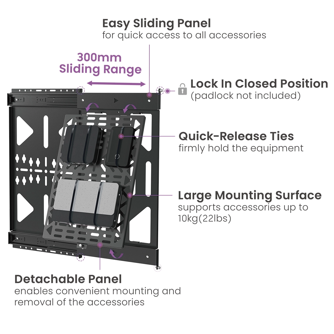 Ten rewolucyjny panel wysuwany zza telewizora został zaprojektowany, by zapewnić szybki dostęp do wszystkich Twoich urządzeń AV, jednocześnie utrzymując przestrzeń za telewizorem wolną od plątaniny kabli i nieporządku. Dzięki możliwości montażu bezpośrednio za telewizorem, SPET70 oferuje nie tylko łatwy dostęp do urządzeń, ale również znacznie poprawia estetykę Twojego salonu, ukrywając nieestetyczne akcesoria. Zbudowany z wytrzymałej stali, panel jest w stanie utrzymać ciężkie urządzenia ważące do 10 kg, co sprawia, że jest on idealnym rozwiązaniem dla różnorodnych urządzeń multimedialnych.